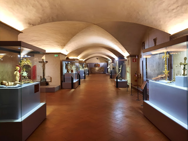 La vetrina di sinistra espone il Crocifisso del 1444 di Michelozzo di Bartolomeo Michelozzi detto Michelozzo.